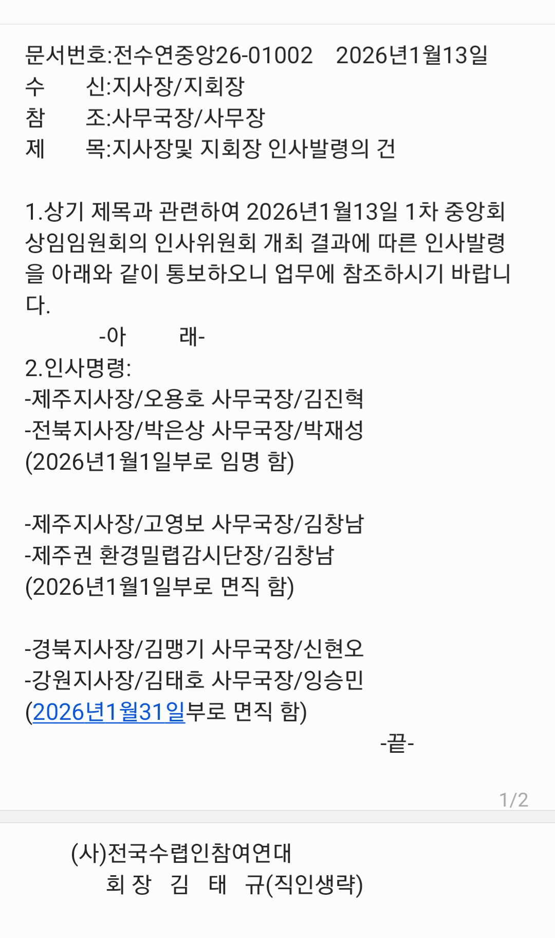 2026년도 1차 상임임원회의 인사위원회 개최 결과에 따라 상기와 같이 지사장 인사명령을 공지 합니다