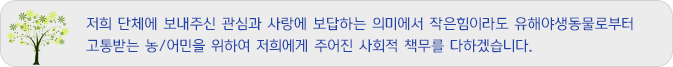 이에 따라 우리 단체에서도 정부에서 시행하는 여러 시책에 부응하여 유해야생조수에 의한 피해를 최소화하고 우리에게 주어진 사회적 책무를 다하고자 우리의 힘과 노력을 다하여 환경보호와 유해조수로 인한 피해방지활동을 추진하고 있습니다.