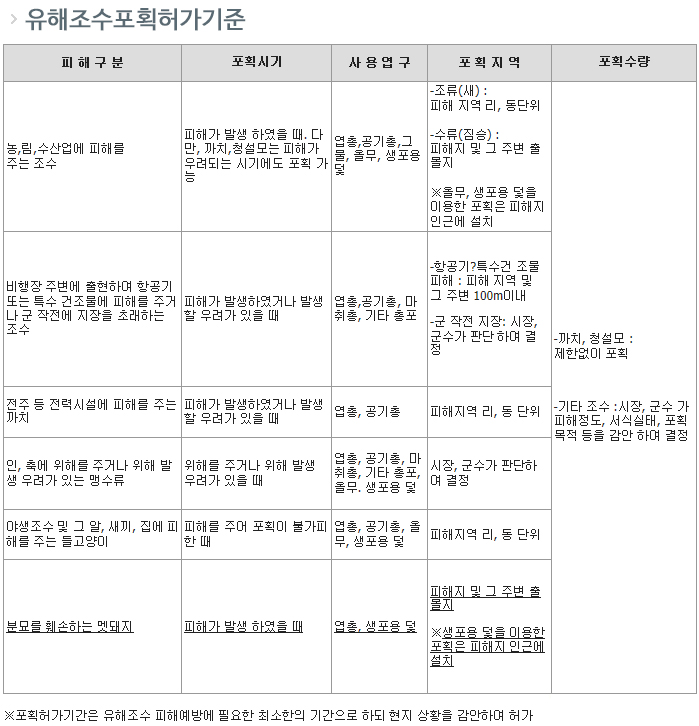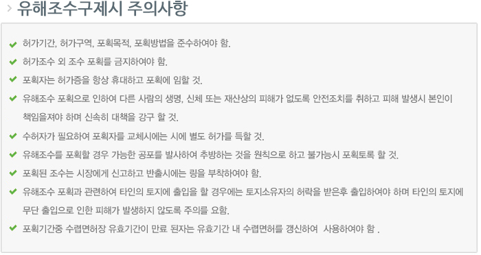 2. 또한 유해조수의 포획허가를 득한 경우에는 허가사항 준수여부, 유해조수 포획을 빙자한 야생조수 불법포획 행위 금지 사항 등을 철저히 이행하여야 할 것임.