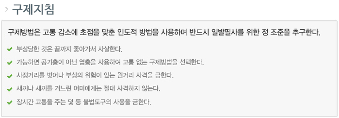 1. 유해조수로 인한 농작물 등의 피해를 감소시키기 위하여 유해조수 포획허가제도를 시행하고 있는 바, 유해조수의 포획시에는 유해조수 포획허가 기준에 따라 야생동물의 보호와 농작물 등의 피해방지의 필요성을 비교·검토한 후 구제에 나서야 할 것임.