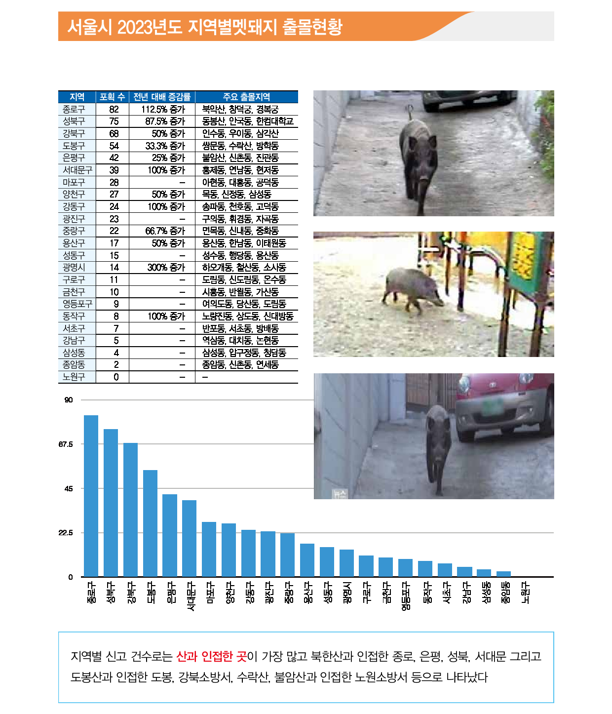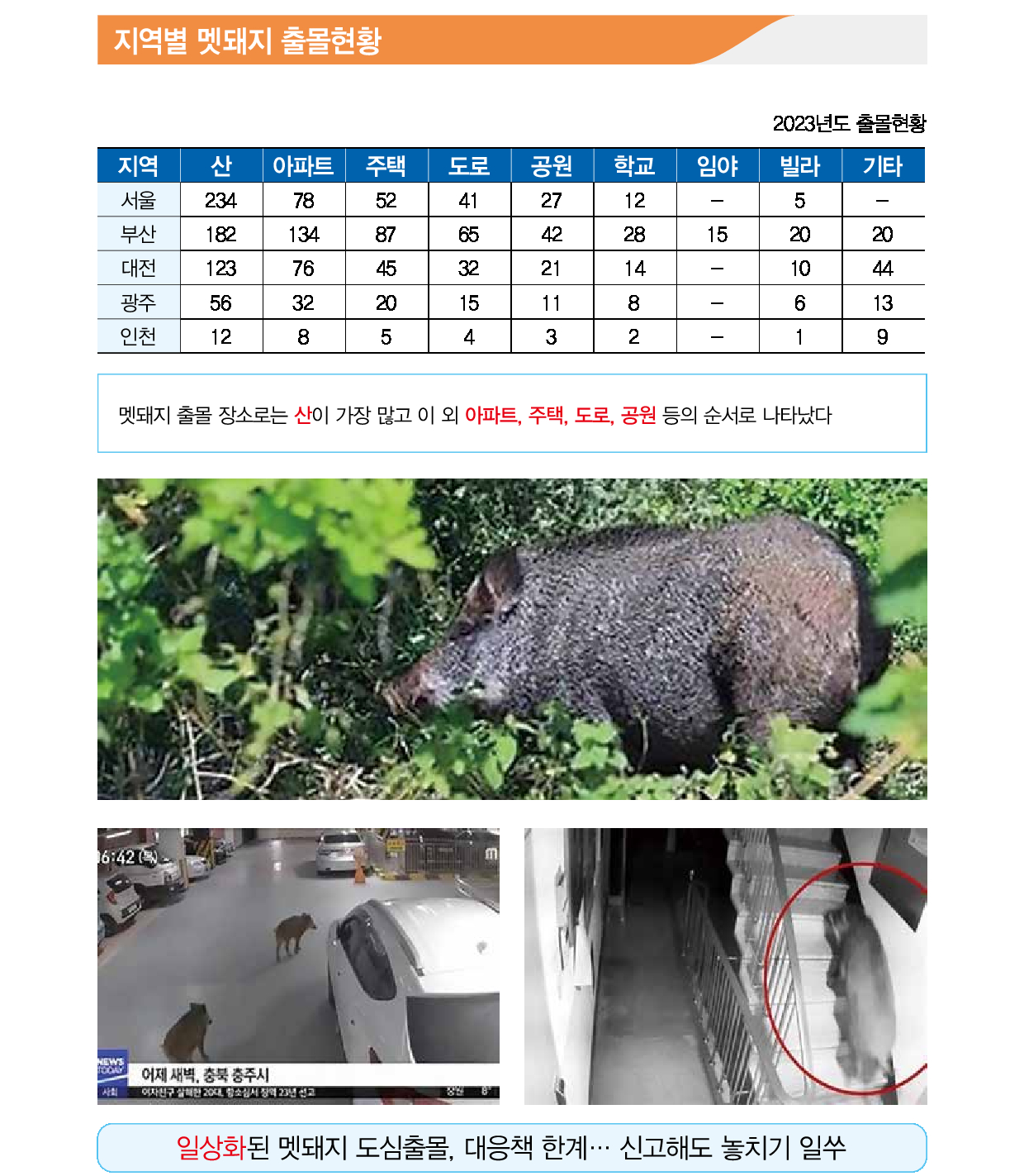 원인: 서식지 파괴, 먹이 부족 등으로 인한 도심/농가 출몰 증가.